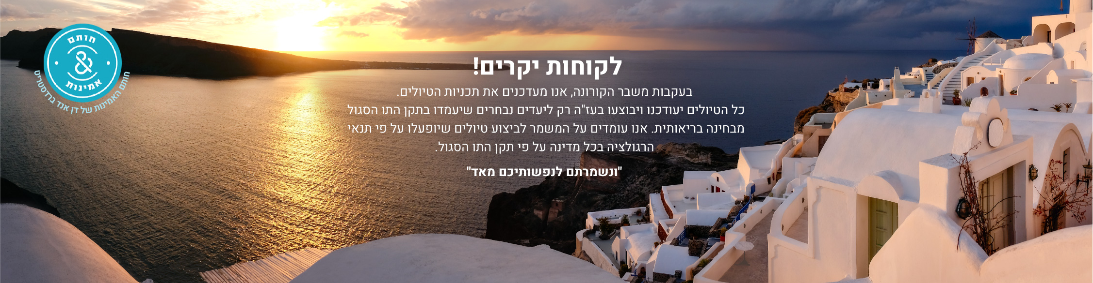 עשרות אלפי מטיילים נסעו עמנו ליעדים רבים בעולם. בכל שנה קרוב ל- 70% מנוסעינו הינם לקוחות חוזרים. עובדה המדברת בעד עצמה… הצטרפו גם אתם למנויי המידעון המופץ רק ללקוחותינו ותיהנו מהטבות ופינוקים השמורים ללקוחותינו הנאמנים !